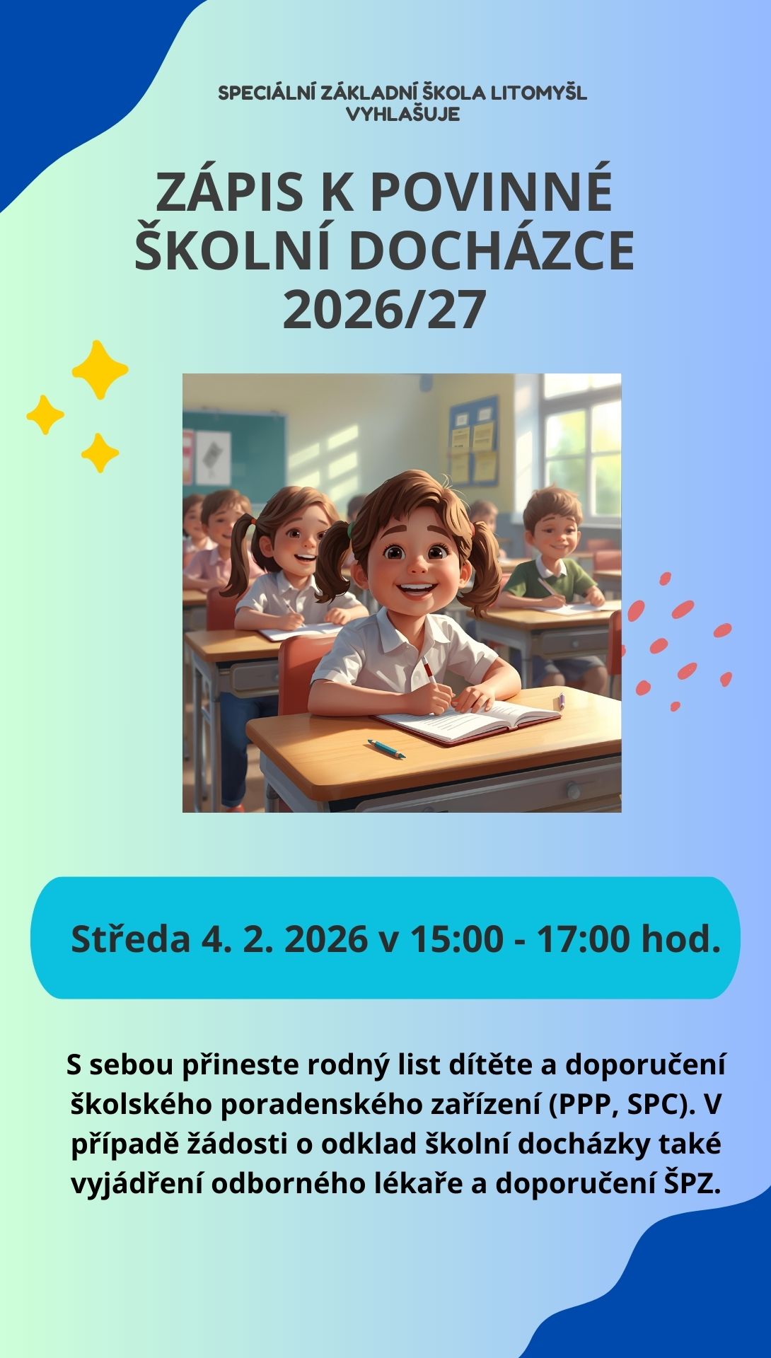 Zápis k povinné školní docházce na rok 2026/2025 se bude konat ve středu 4. února 2026.